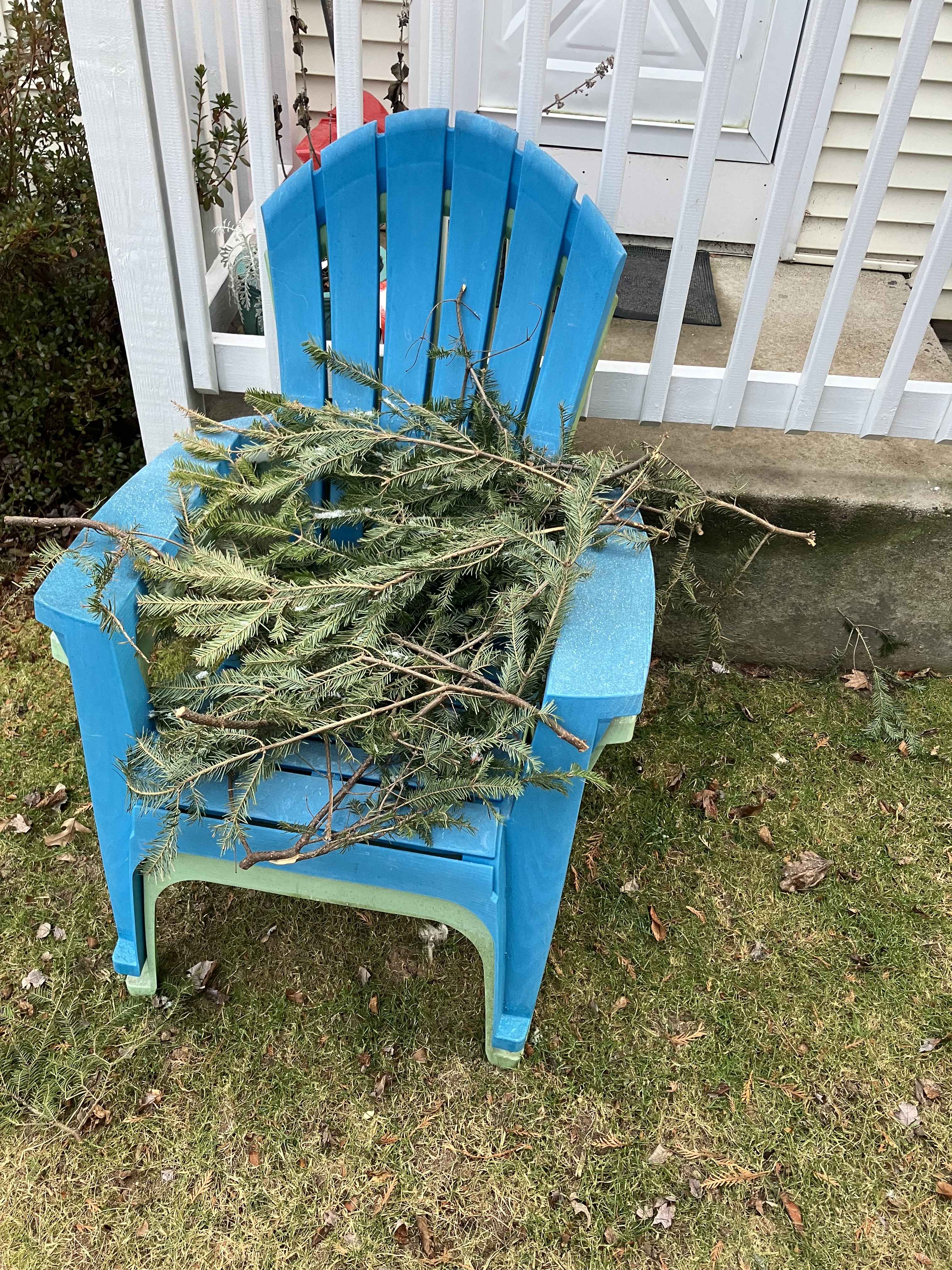 I stuffed the branches in the back seat of my car and rode around with them and a fresh, balsamy scent for a few days. Then the branches ended up on the lawn, and then up on a plastic Adirondack chair still outside.